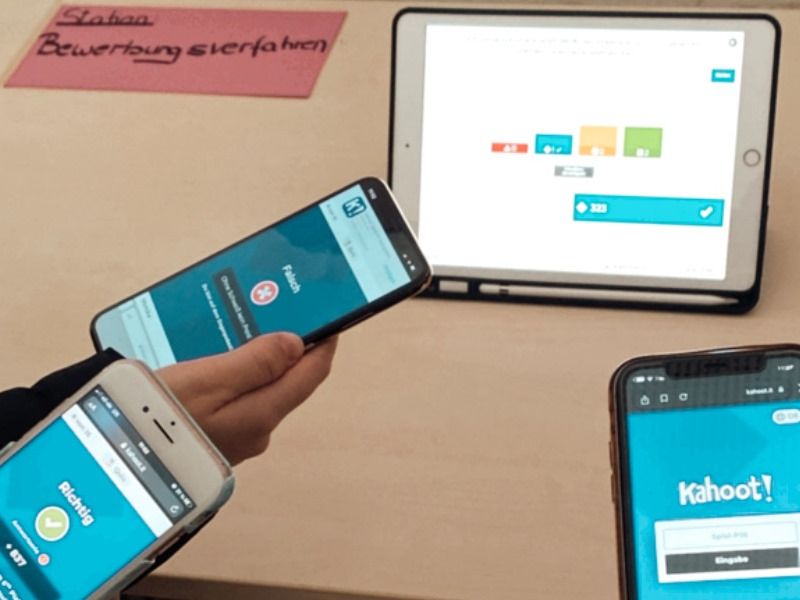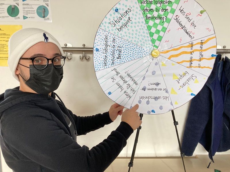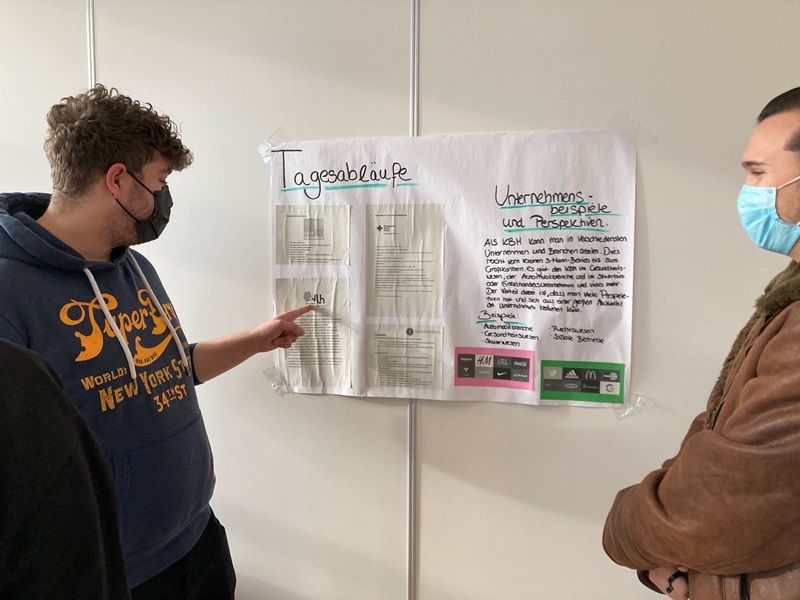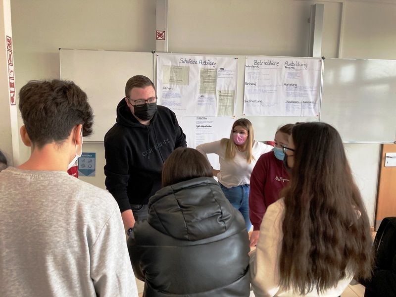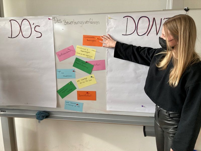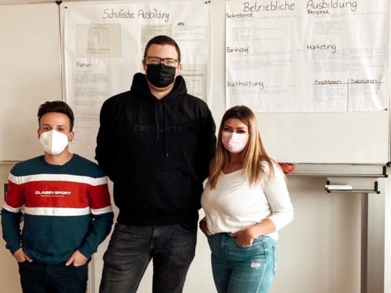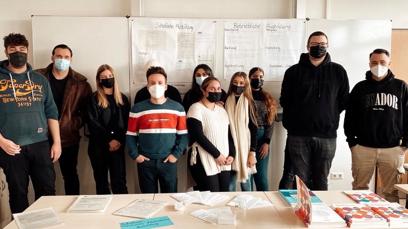 Die Kaufleute für Büromanagement fangen im Dezember 2021 an mit ihren Veranstaltungen; Schülerinnen und Schüler aus der Höheren Handelsschule nehmen das Angebot gerne an und gehen in die eigens für die so genannte Berufsberatung auf Augenhöhe hergerichteten Räume. Dort gibt es Poster, die einen Überblick über die betriebliche und die schulische Ausbildung geben, Stände mit iPads, an denen man sich selbstständig informieren kann und natürlich die Azubis selbst, die aus erster Hand von ihren Erfahrungen über ihre Ausbildung berichten.