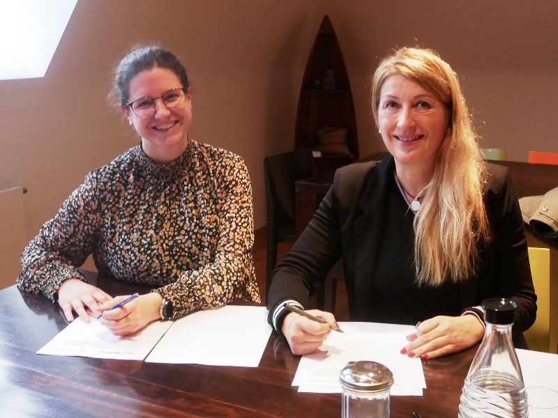 Frau Dr. Langner (rechts), Schulleiterin des Berufskollegs an der Lindenstraße, sowie Frau Schwarz (links, Schokoladenmuseum) unterzeichneten den Vertrag am 30.11.2022.