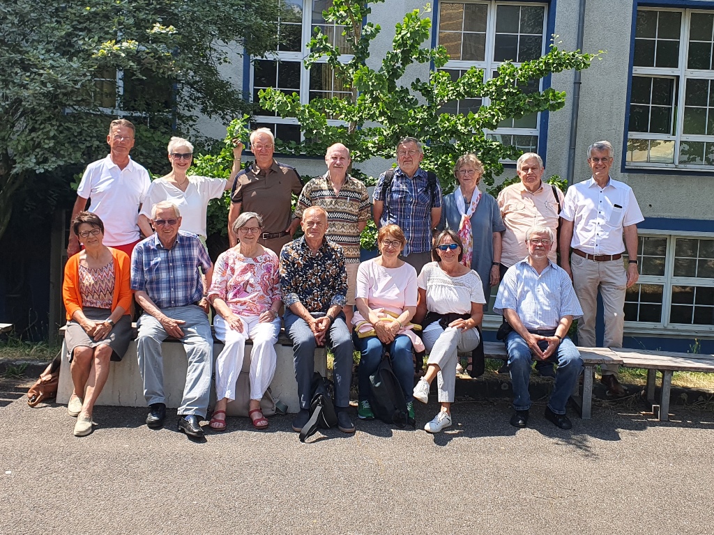 Am Freitagmittag, 16.Juni 2023 besuchten uns 14 von 22 ehemaligen Absolventen/-innen der Klasse Goa 1973 und ihr ehemaliger Klassenlehrer Herr Volkwein. Das Wiedersehens-Treffen war nach dem dreißigjährigen Abi-Jubiläum 2003 erst das zweite seiner Art. Von außen betrachtet bekam man jedoch den Eindruck, dass die Gruppe ein eingespieltes Team war, das direkt wieder viel miteinander lachen konnte.