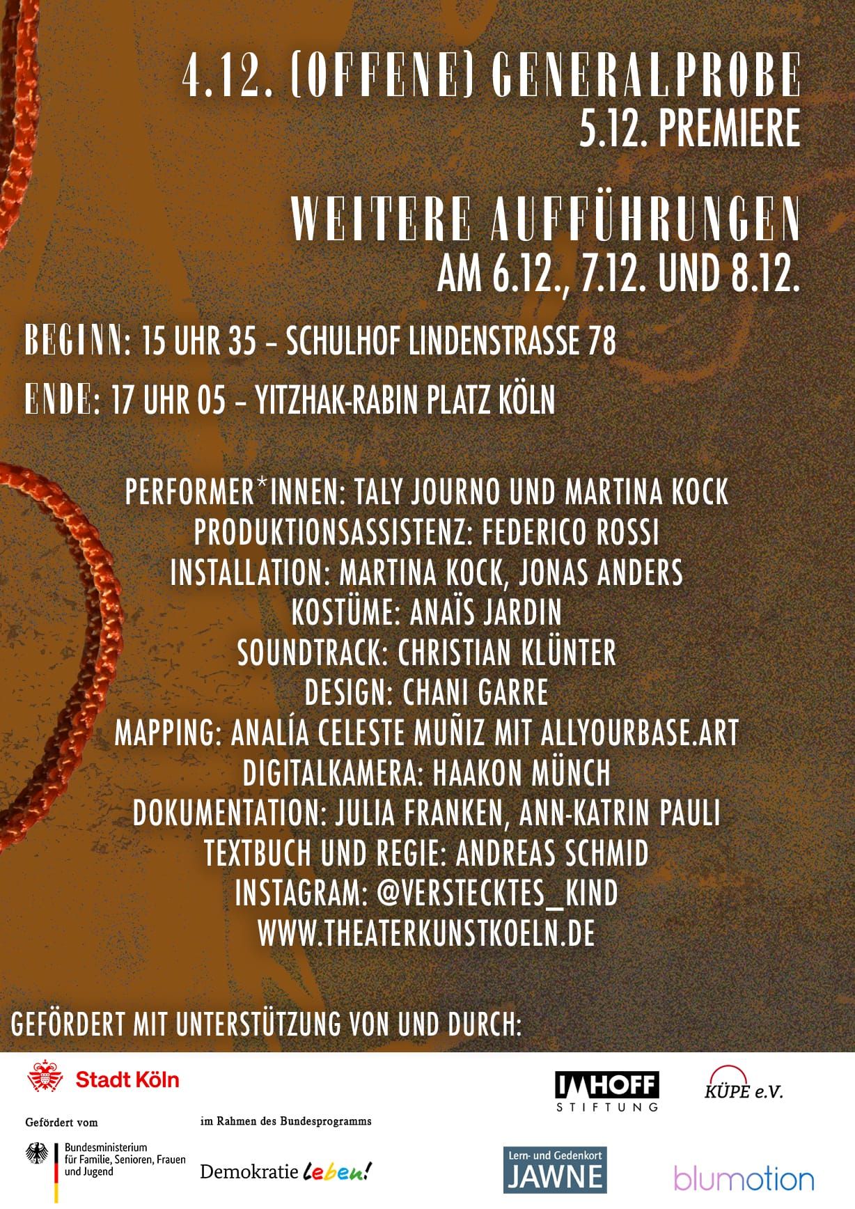 Vom 5.12.-8.12.23 führt das Theaterteam von Theaterkunst Köln seine Performance mit dem Namen „Enfant Caché – Verstecktes Kind – Hidden Child“ auf.
