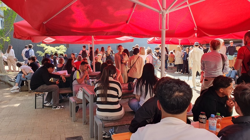 Strahlender Sonnenschein trug zur entspannten Atmosphäre bei: Unter der großen Platane, zwischen Sonnenschirmen und Tischtennisplatten, genossen die Schülerinnen und Schüler Köstlichkeiten vom Grill und Kaffeespezialitäten der Schülerfirma Campua. Im Schulgebäude luden kreativ gestaltete Stände zu Diskussionen ein, darunter der englischsprachige Nachhaltigkeits-Stand aus dem bilingualen Unterricht.