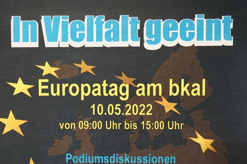 Nach zwei Jahren Schulleben auf Distanz war dies die erste Gelegenheit, um die Schulgemeinschaft einmal wieder zusammen zu bringen, fand Schulleiterin Dr. Alexandra Langner in ihrer Begrüßungsrede. 72 Jahre nachdem Robert Schuman mit seiner Rede den Grundstein für die spätere Europäische Union aus dem Bestreben heraus gelegt hatte, dauerhaften Frieden in Europa zu schaffen, herrscht Krieg in der Ukraine, und es wird klar, dass Frieden in Europa keine Selbstverständlichkeit ist und die europäische Idee der Pflege bedarf. Das Motto der Europäischen Union, Einheit in Vielfalt, passte nicht nur auf die vielen Veranstaltungen, sondern auch auf die Tatsache, dass die Schülerinnen und Schüler des BKaL aus insgesamt 16 Bildungsgängen diesen Tag gemeinsam begingen. So umfasst das Berufskolleg neben den Berufsschulbildungsgängen des dualen Systems, die Fachoberschule, die Fachschule, die Höhere Handelsschule und das Wirtschaftsgymnasium. Nicht nur das: Viele Schülerinnen und Schüler haben auch familiäre Wurzeln, die weit über die Grenzen der EU hinausweisen. Deshalb sind Veranstaltungen wie der Europatag ein wichtiger Teil der Werteerziehung am BKaL, um über den Tellerrand des fachlichen Lernens hinauszublicken und sich über die kulturellen und politischen Grundlagen unseres Zusammenlebens bewusst zu werden.