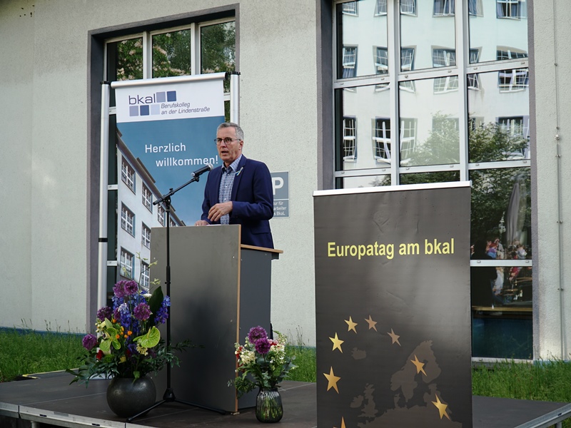 Bürgermeister Andreas Wolter ging zu Beginn der Veranstaltung in seinerEröffnungsrede insbesondere auf das Engagement der Stadt im Umgang mit Flüchtlingen und Menschenrechtsfragen ein. Anschließend hob die Schulleiterin Frau Dr. Alexandra Langner hervor, dass Europa und Nachhaltigkeit zwei zentrale Leitziele des Berufskollegs an der Lindenstraße sind. So wurden zu diesen Themenkomplexen zahlreiche Veranstaltungen angeboten, wie z.B. von Amnesty International, dem Bündnis Kölner Seebrücke, einem Mitglied von Menschenfreude e.V., der eine Lesung über sein Buch zu seinem Hilfseinsatz in der Ukraine hielt, und einem ehemaligen Kollegen, der sich mittlerweile stark in der Integrationshilfe engagiert. Des Weiteren wurden zwei Schülerinnen aus dem Wirtschaftsgymnasium des BKaL geehrt, die beim 70. Europäischen Wettbewerb den ersten Preis für das Land NRW gewonnen haben.